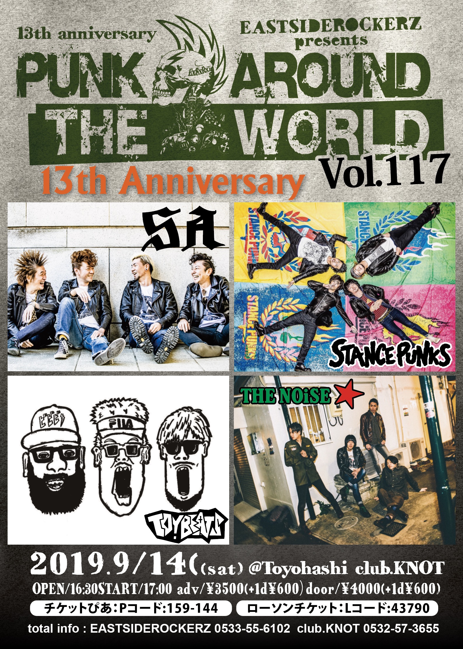 2019.09.14Sat 豊橋 club KNOT PUNK AROUND THE WORLD VOL.117 〜13th anniversary OPEN 16:30 START 19:00ADV 3,500yen DOOR 4,000yen + drink orderSA STANCE PUNKS TOYBEATS THE NOiSE チケットぴあ 159-144 ローチケ 43790 チケット発売日 21日 AM10時〜発売開始 total info club KNOT 0532-57-3655