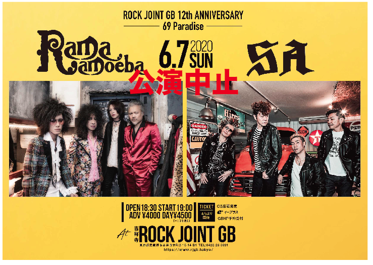 6/7(日)ROCK JOINT GB 12th ANNIVERSARY~69 Paradiseは新型コロナウイルス感染状況、社会情勢を踏まえ検討しました結果、誠に残念ですが開催を中止させて頂く事になりました。