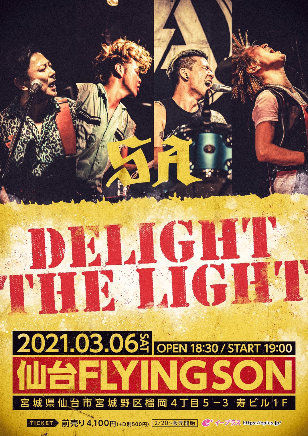 2021.03.06Sat 仙台FLYING SON DELIGHT THE LIGHT@仙台FLYING SON OPEN 18:30 START 19:00ADV 4100yen DOOR TBA + drink order チケット発売日:2021年2月20日 イープラス お問い合わせ:仙台FLYING SON/ 022-297-6304