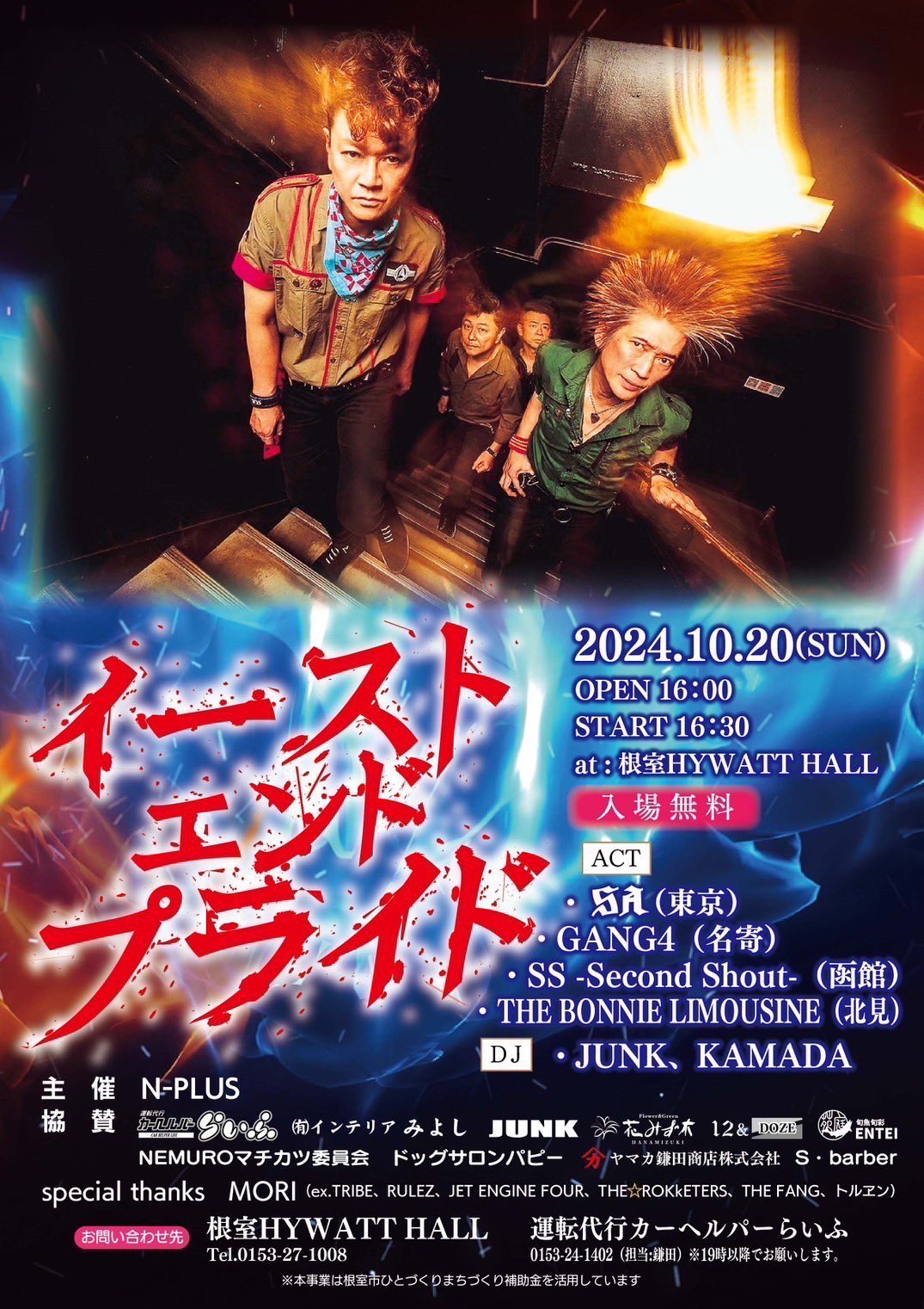 2024.10.20Sun 根室HYWATT HALL(北海道) イースト・エンド・プライド OPEN 16:00 START 16:30ADV 無料yen DOOR 無料yen + drink order GANG4(名寄) SS -Second Shout-(函館) THE BONNIE LIMOUSINE(北見) お問い合わせ:根室HYWATT HAL https://www.hywatthall.com/