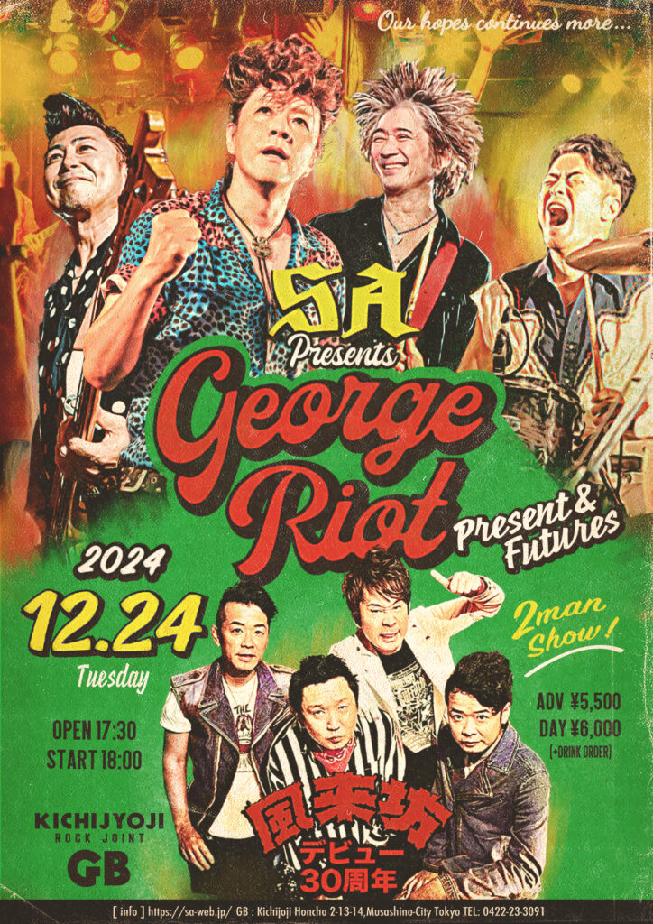 2024.12.24Tue 吉祥寺ROCK JOINT GB SA「George RIOT 」& 風来坊「デビュー30周年」 「Present & Future」 OPEN 18:30 START 19:00ADV 5500yen DOOR 6000yen + drink order w/風来坊 ※年齢制限:未就学児童入場不可(小学生以上のご入場される方全てにチケット必要) ■一般発売中 https://eplus.jp/sa/ お問い合わせ:吉祥寺GB 0422-23-3091