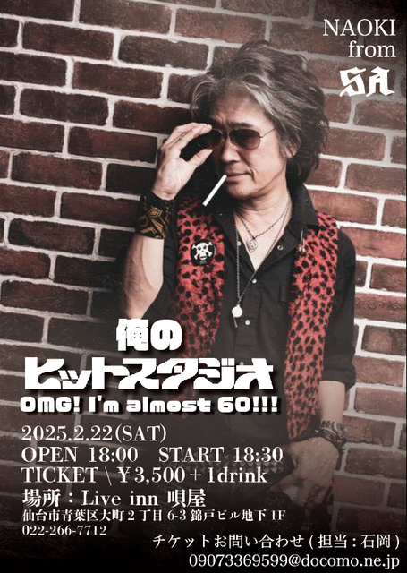 2025.02.22Sat 仙台LIVE INN唄屋 俺のヒットスタジオ OPEN 18:00 START 18:30ADV 3500yen DOOR TBA + drink order お問い合わせ:09073369599@docomo.ne.jp(担当:石岡)