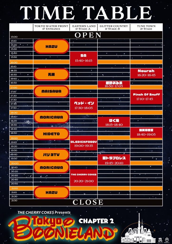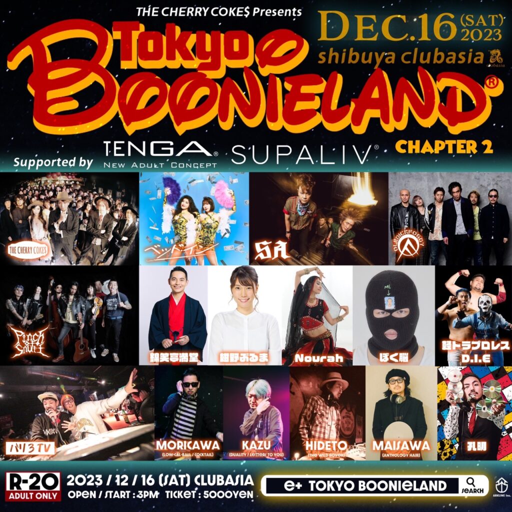 2023.12.16Sat 渋谷 clubasia THE CHERRY COKE$ Presents“TOKYO BOONIELAND®”Chapter2 OPEN 15:00 START 15:00ADV 5000yen DOOR 5500yen + drink order チケット販売サイト https://eplus.jp/sf/detail/3981000001-P0030001P021001?P1=1221